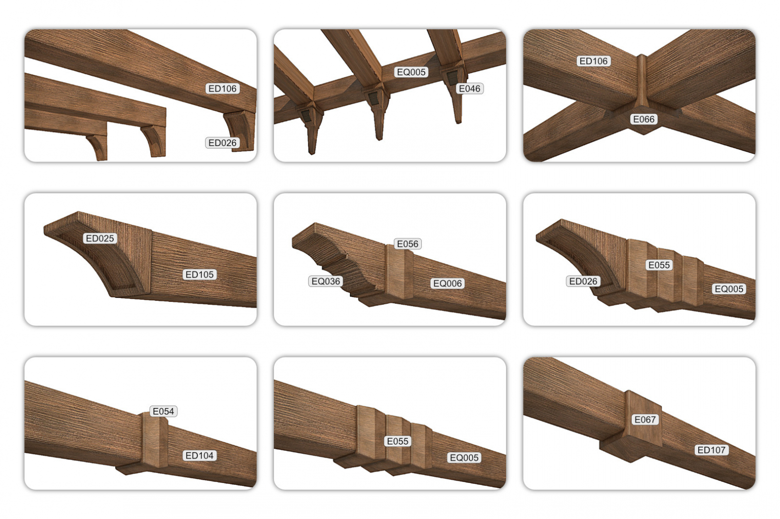 • Elemente de îmbinare: Asigură o finisare perfectă și ascund îmbinările dintre grinzi.