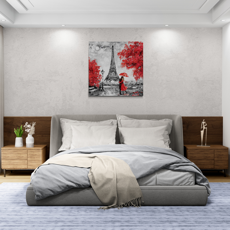 Eiffel sub ploaie roșie cu cuplu, simbol al iubirii pariziene.