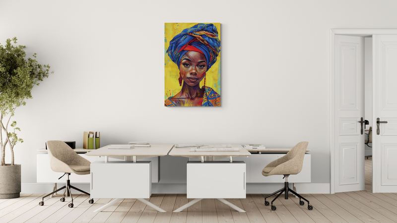 Un portret vibrant cu o femeie în turbant albastru pe fond galben intens, capturând esența culorilor africane și a expresiei puternice.