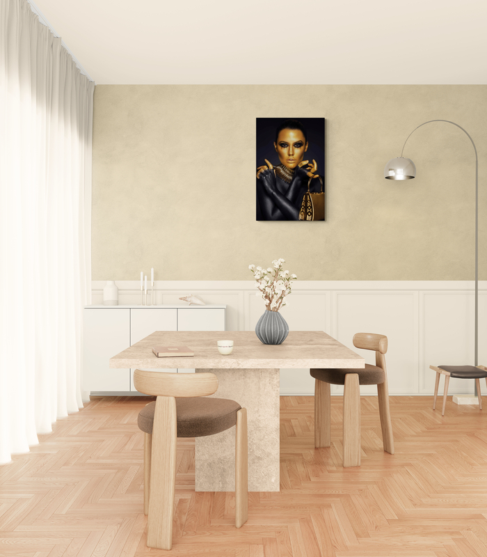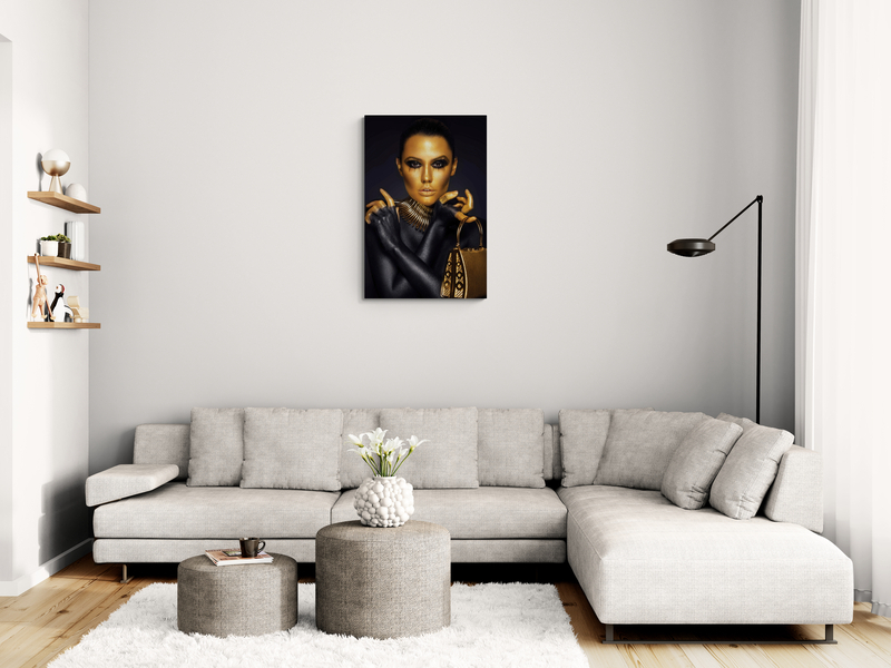 O femeie aurită în ținută urbană, emanând încredere și stil modern. Ideal pentru spații contemporane, acest tablou adaugă un touch de glamour.