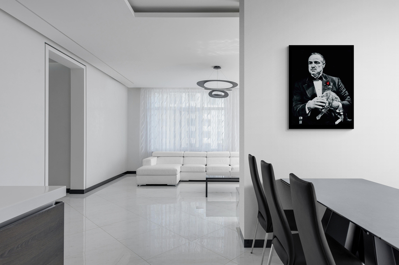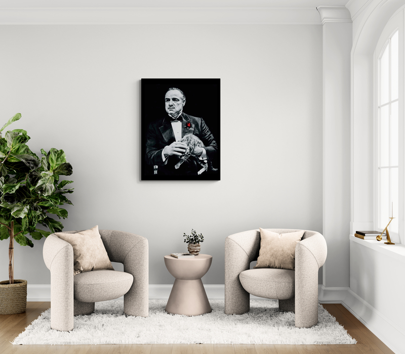 Inspirat de iconicul Naș, acest tablou în alb-negru cu accent roșu capturează esența puterii mafiote și a loialității, cu figura ținând o pisică.