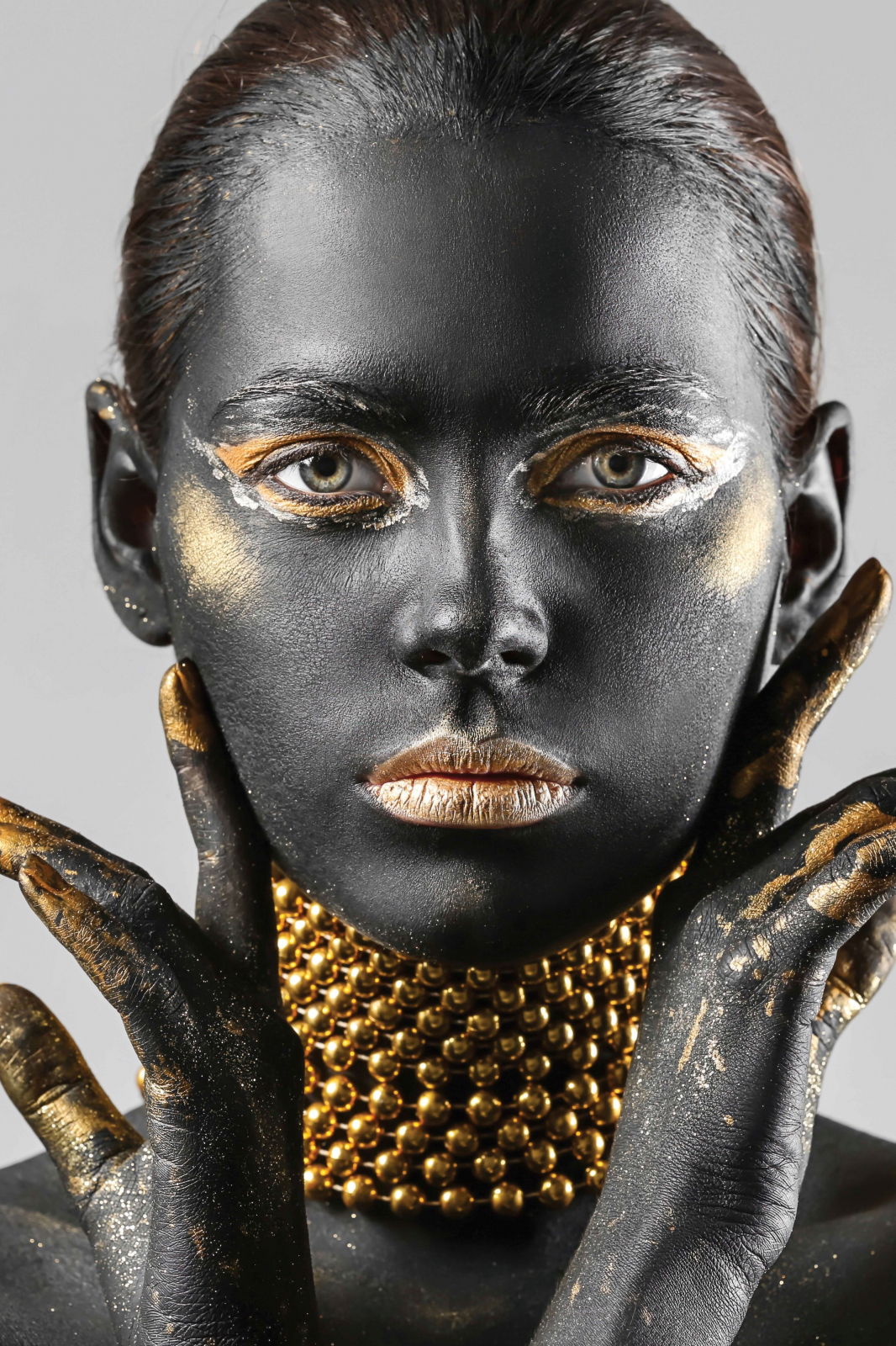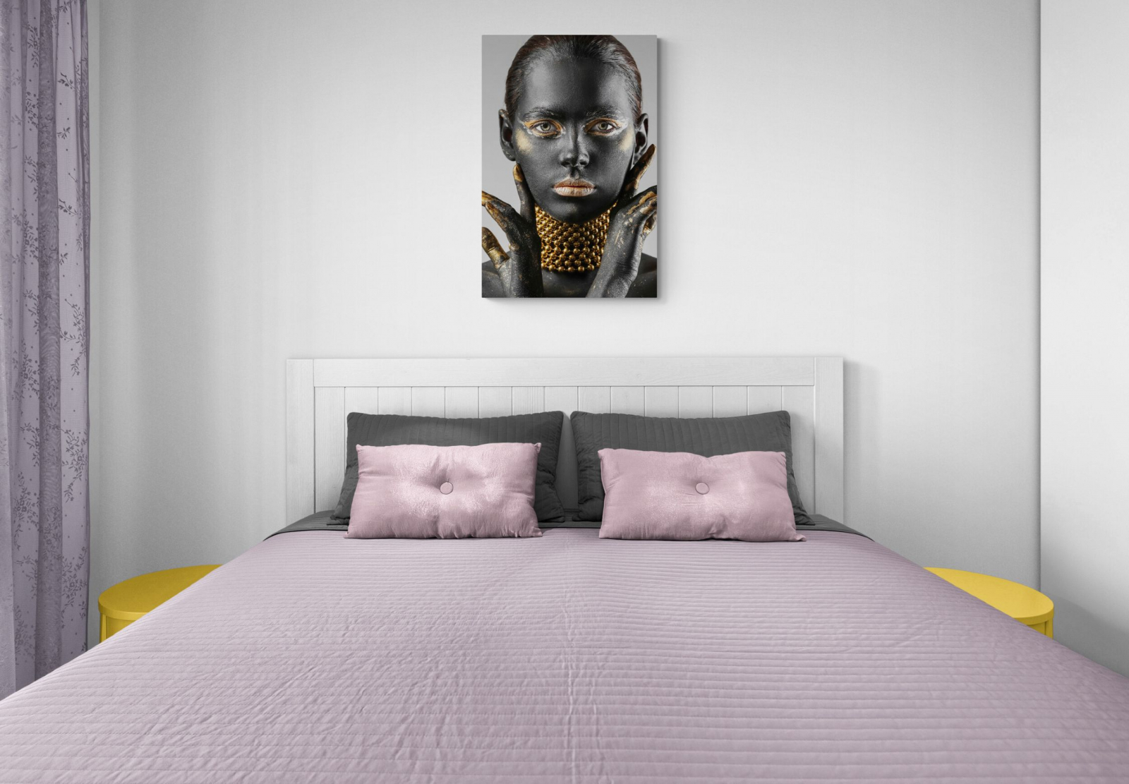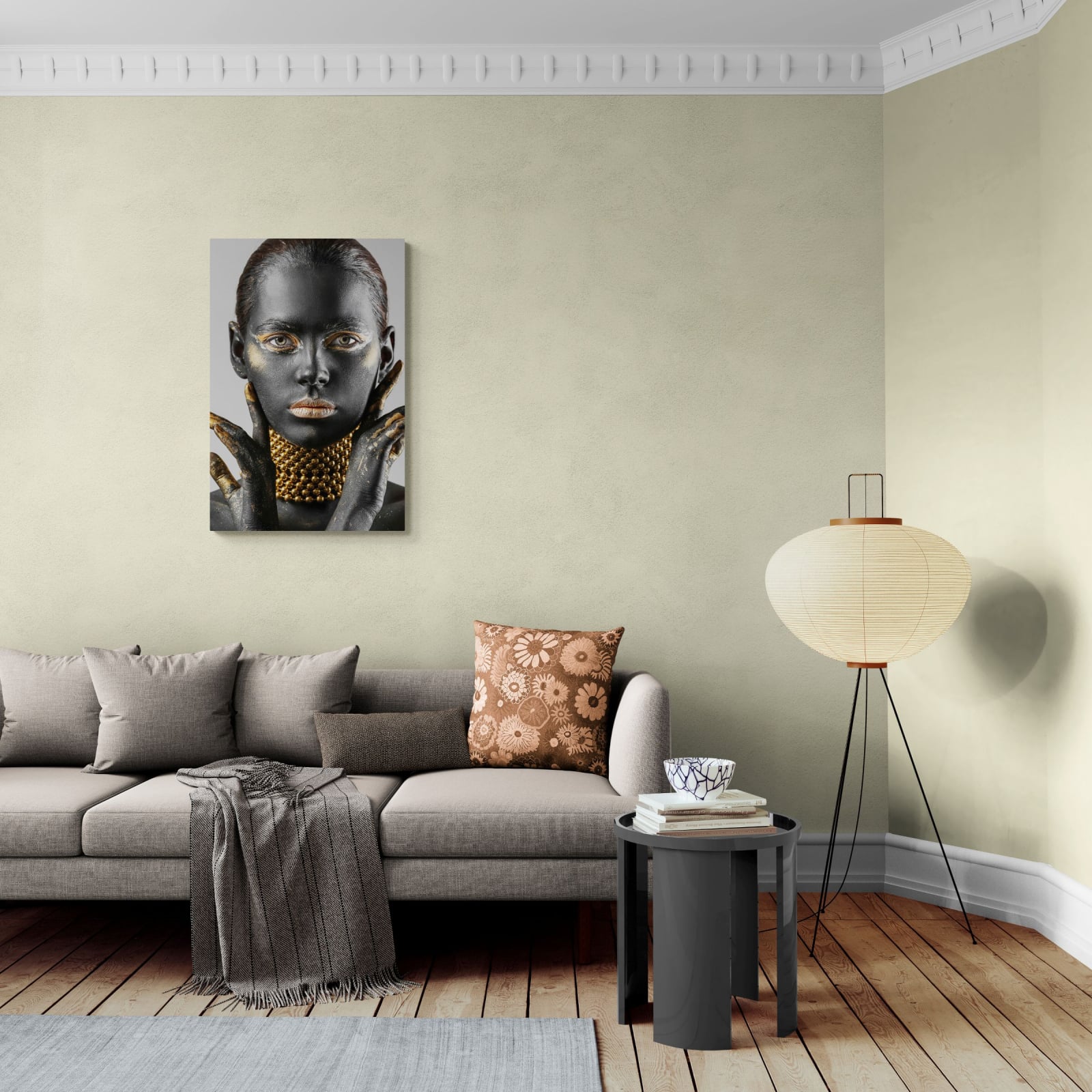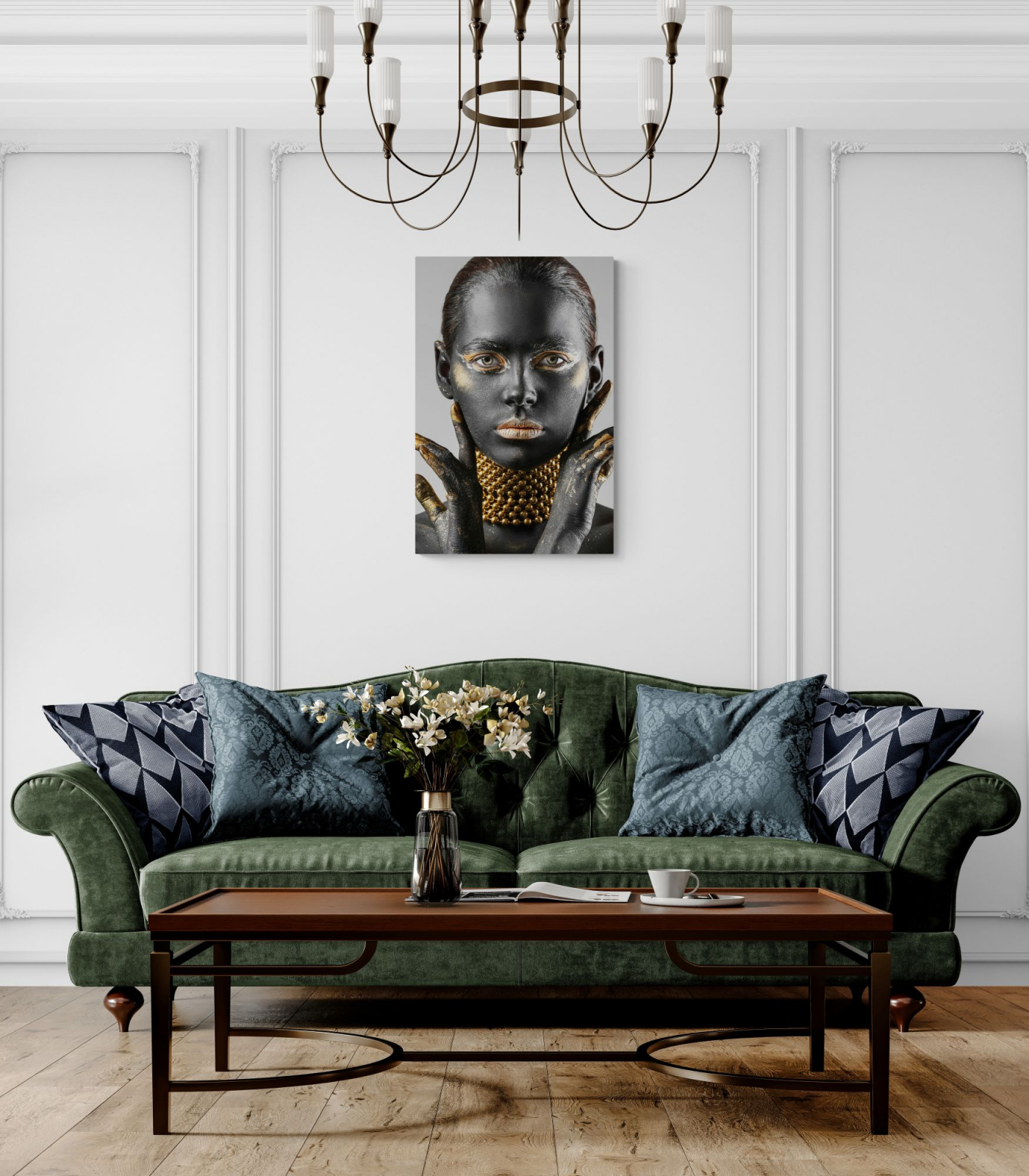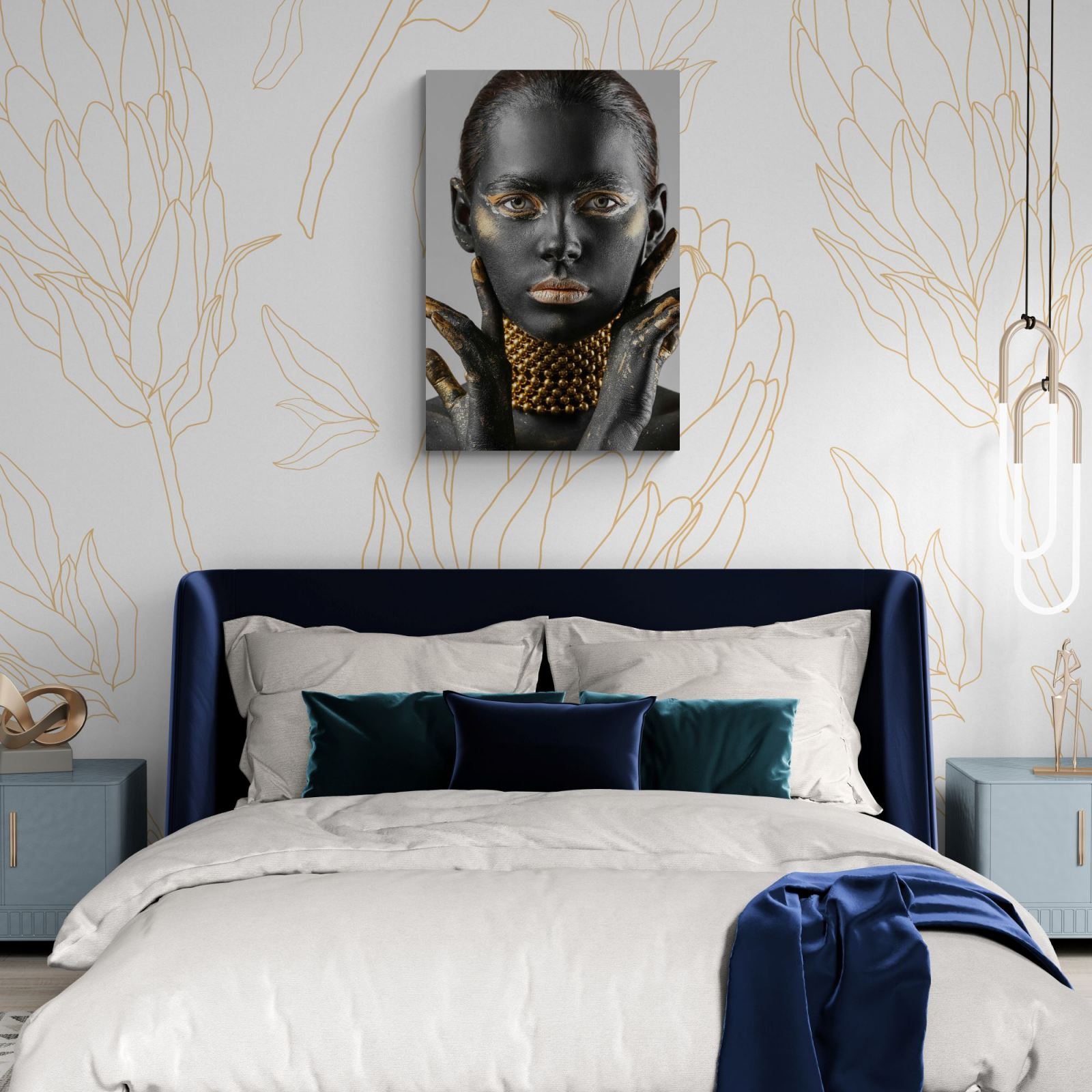 Descoperiți misterul și eleganța africană în acest tablou captivant, unde o figură enigmatică cu piele neagră și accente aurii privește spre infinit, evocând putere interioară și frumusețe ancestrală. Imprimat pe canvas de înaltă calitate, perfect pentru a adăuga un aer exotic oricărui interior modern.