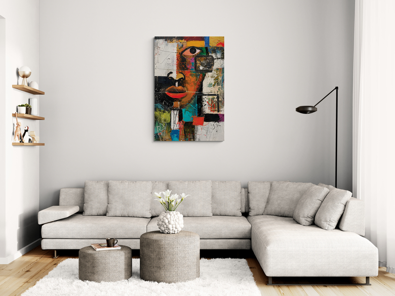 Un portret abstract în stil cubist, cu fragmente colorate ce formează o față enigmatică, evocând emoții profunde și creativitate nelimitată.