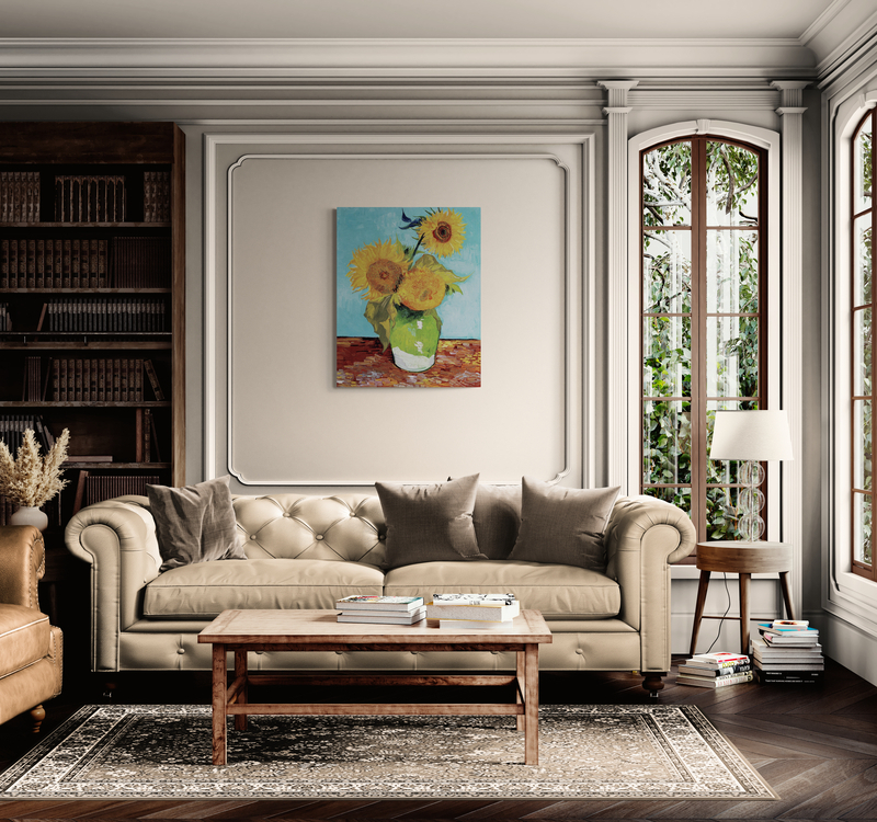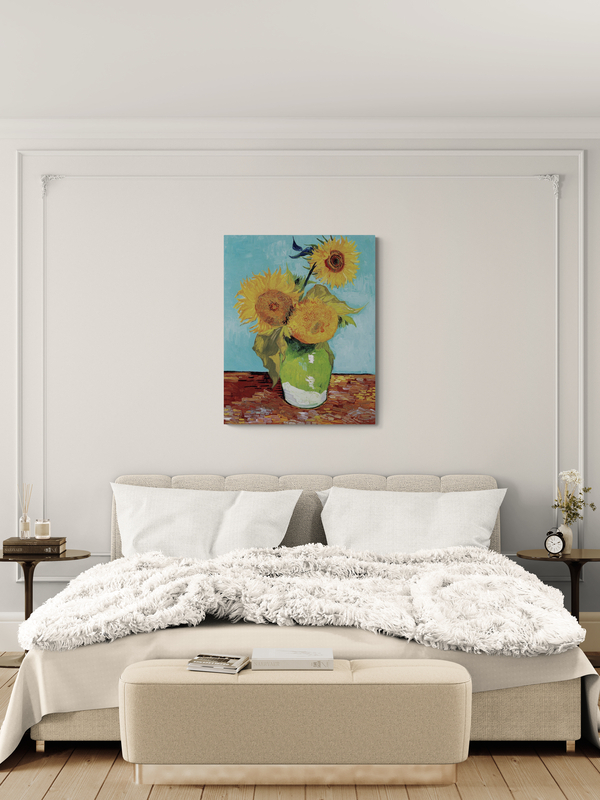 Bucurați-vă de explozia de culori solare în această reproducere vibrantă a operei lui Vincent van Gogh, unde trei floarea-soarelui strălucesc cu intensitate post-impresionistă. Imprimat pe canvas de calitate premium, acest tablou adaugă energie și optimism oricărui interior, ideal pentru iubitorii de artă clasică și natură.