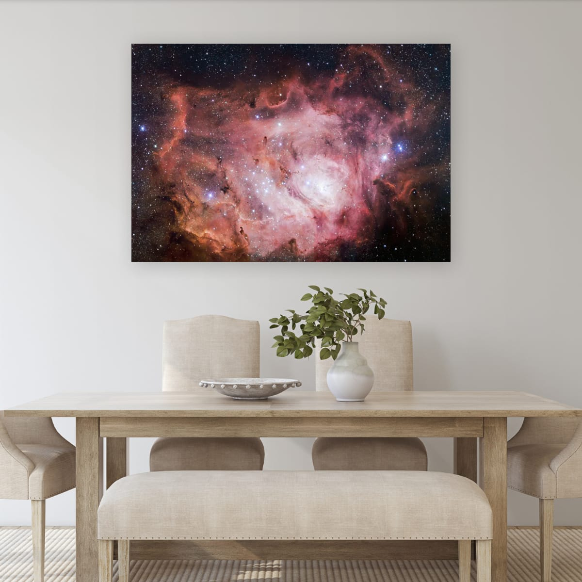 Această uimitoare operă de artă cosmică dezvăluie frumusețea complexă a unei nebuloase, unde nuanțe vibrante de roz și portocaliu se învârt pe fundalul a nenumărate stele. Strălucirea eterică și formațiunile delicate invită la contemplarea vastității universului. Fiecare detaliu prezintă interacțiunea dinamică dintre lumină și culoare, făcându-l un punct focal captivant pentru orice spațiu. Perfectă pentru cei care apreciază minunile cosmosului, această piesă adaugă o notă de eleganță celestă decorului dvs.