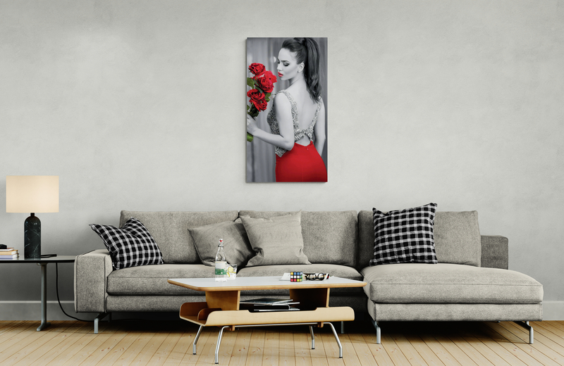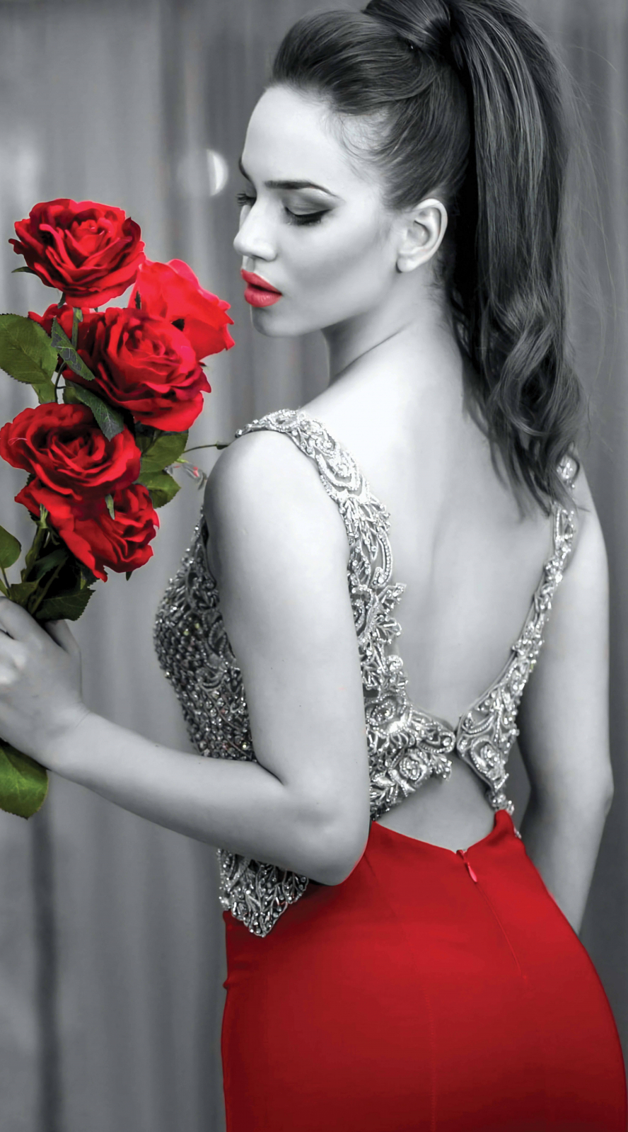 Femeie cu buchet roșu, reprezentând eleganță feminină.